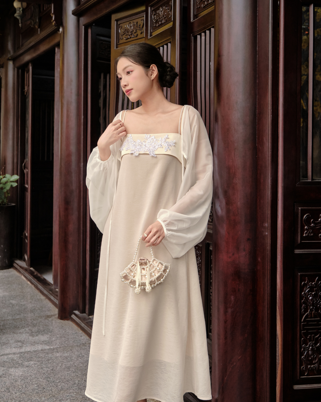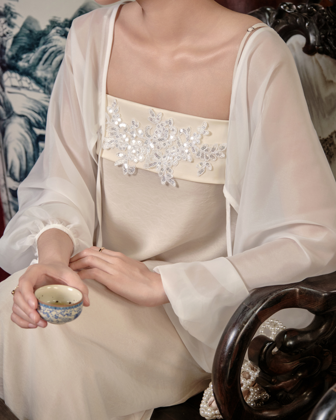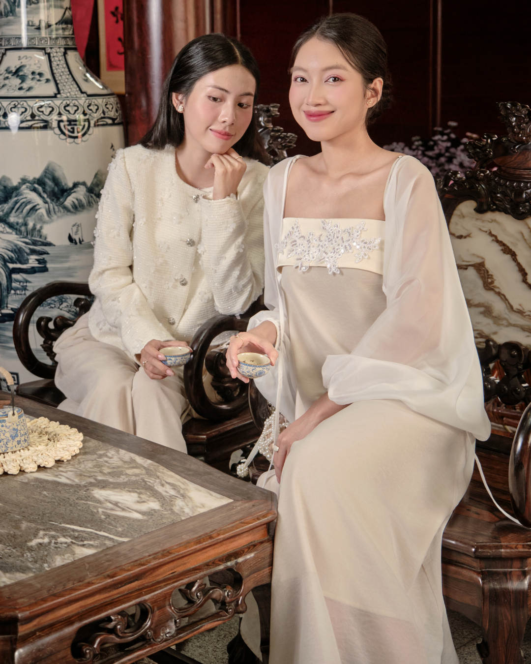 - Đính kết ren hoa kim sa sang trọng, một sự kết hợp dịu dàng giữa chất liệu voan và lụa Tô Châu.