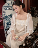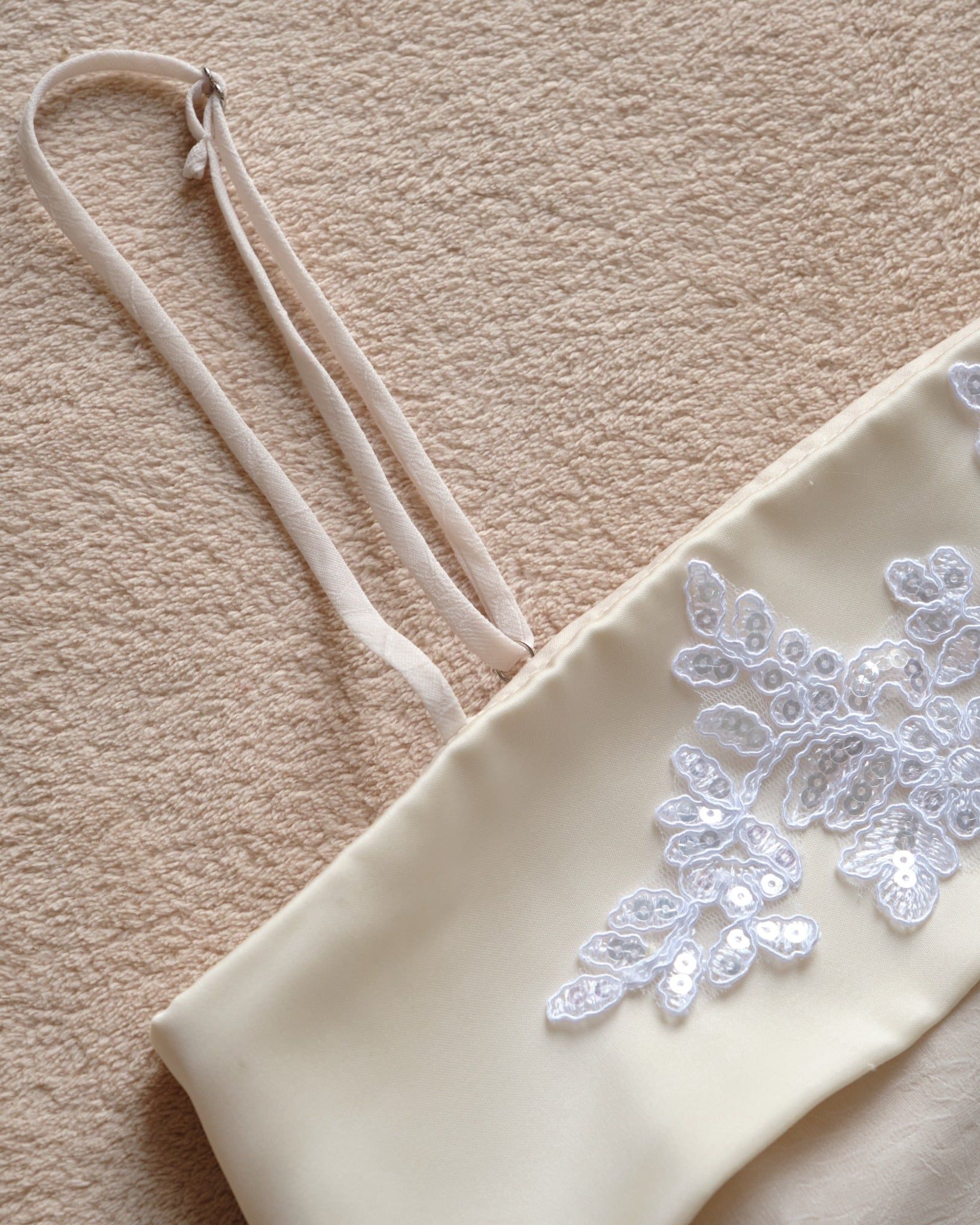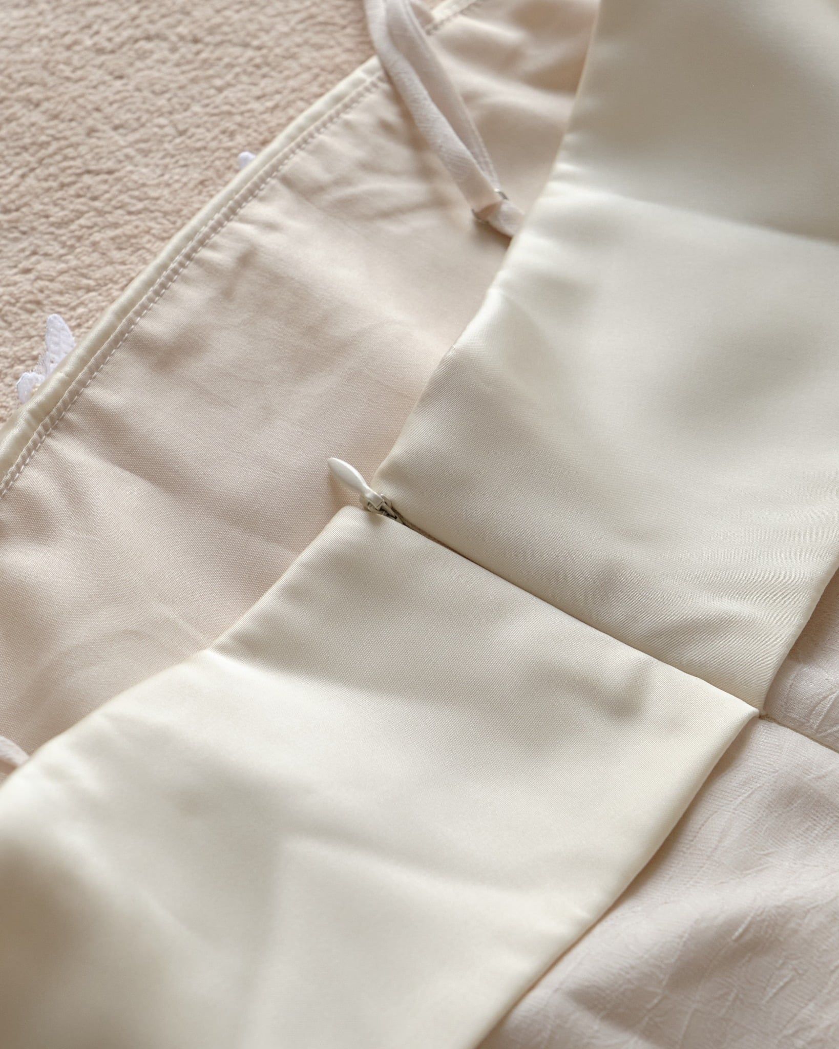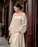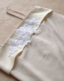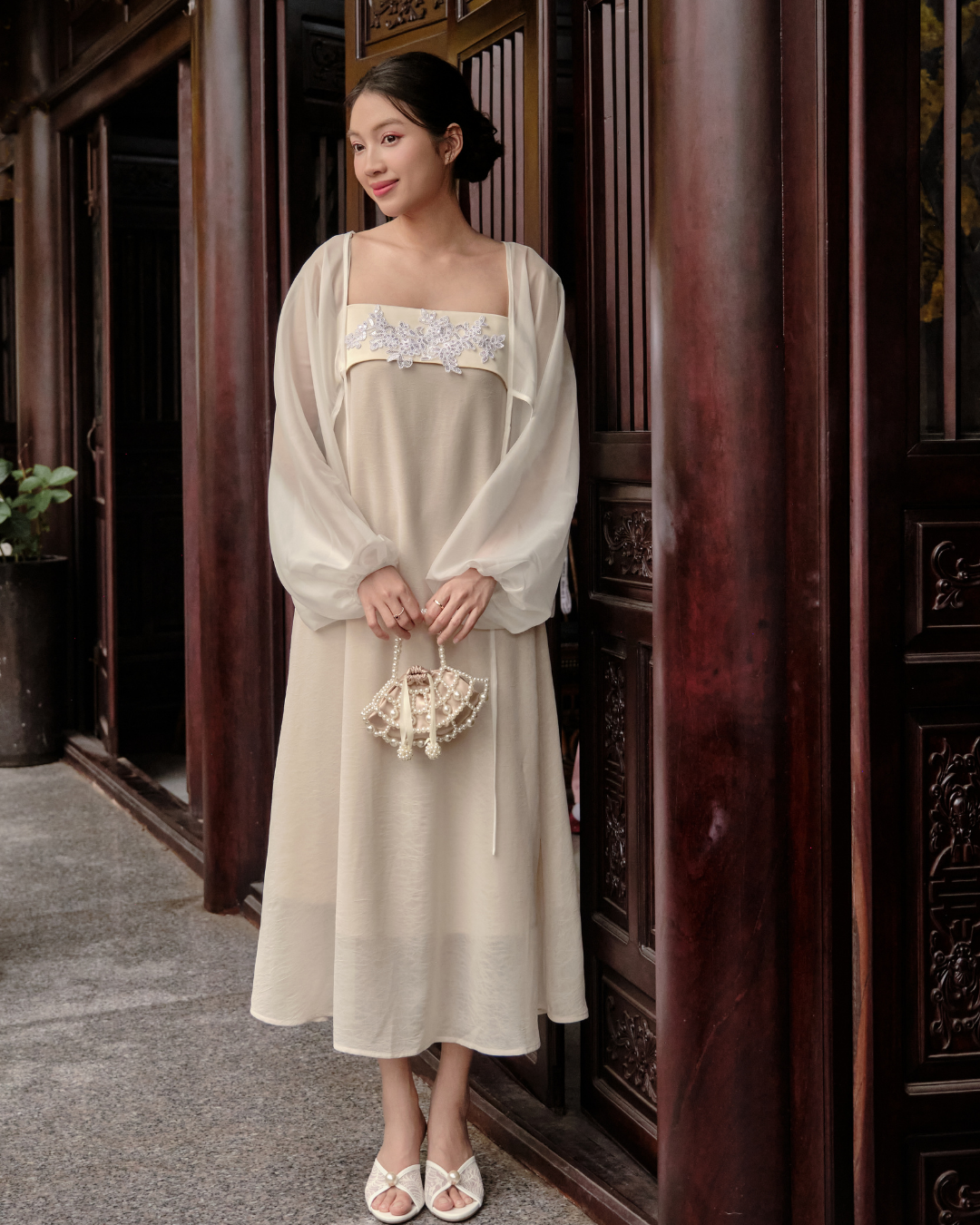 - Đính kết ren hoa kim sa sang trọng, một sự kết hợp dịu dàng giữa chất liệu voan và lụa Tô Châu.