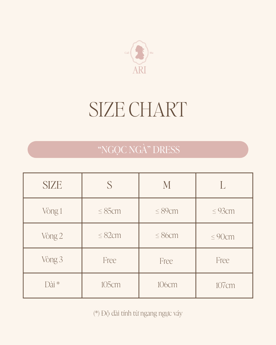 - Size S: Vòng 1 ≤ 85cm/ Vòng 2 < 82cm / Vòng 3: Free/ Dài váy 105cm. ( tính từ ngang ngực váy )